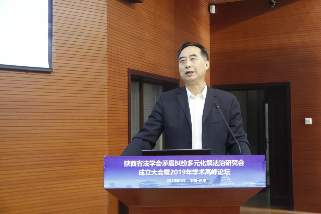 陕西省法学会党组书记、副会长杨建军向陕西省法学会矛盾纠纷多元化解法治研究会授牌,并代表省法学会对研究会的成立表示热烈的祝贺!杨建军对本研究会校企合办的创新特点给予了高度认可,并倡导通过举办学术沙龙或者研讨会,增强学术氛围,积极响应党的号召,回应人民的呼声,满足人民群众的需要。