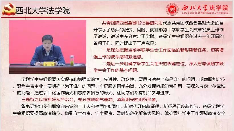 最后,共青团陕西省委副书记鲁镇同志就当前形势提出了三点意见:一是深刻把握当前学联学生会工作面临的新形势新任务,切实增强工作的使命感和紧迫感。二是进一步明确学联学生会组织的职能定位,深入思考谋划学联学生会工作的基本问题。三是持之以恒抓好从严治会,充分展现朝气蓬勃、清新阳光的组织形象。