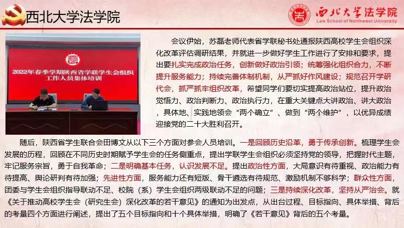 随后,陕西省学生联合会田博文从以下三个方面对参会人员培训。一是回顾历史沿革,勇于传承创新。二是明确基本任务,认识发展不足。三是持续深化改革,坚持从严治会。